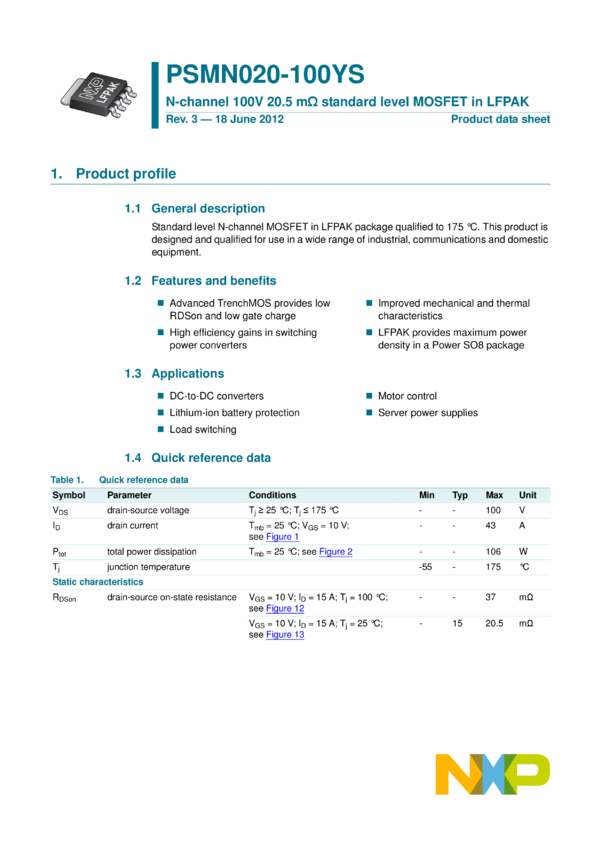 PSMN020-100YS N-channel 100V 20.5mΩ standard level MOSFET in LFPAK