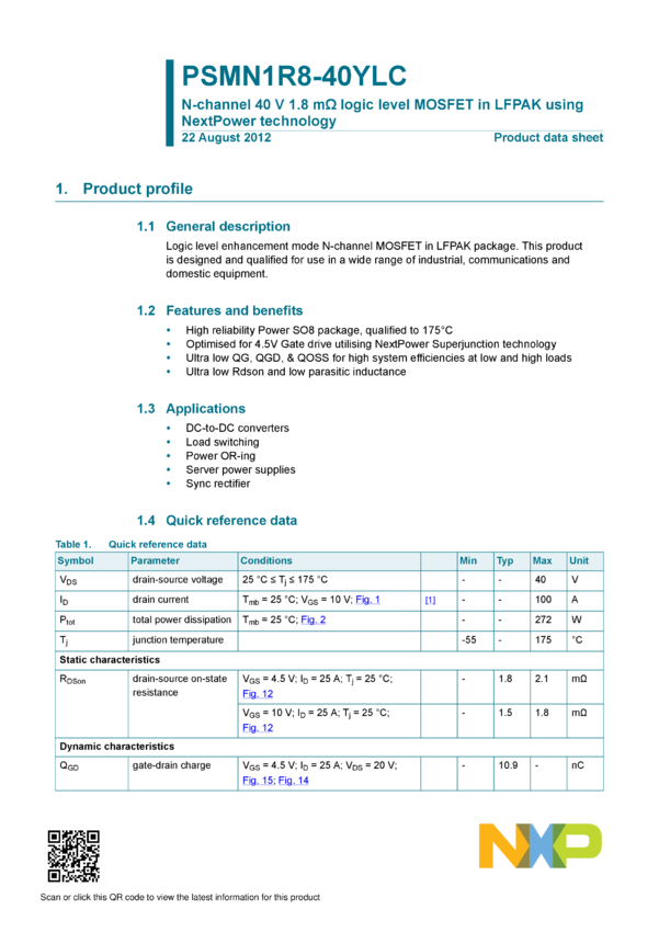 PSMN1R8-40YLC N-channel 40 V 1.8 mΩ logic level MOSFET in LFPAK using NextPower technolog...