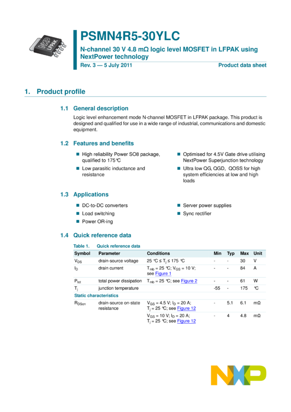 PSMN4R5-30YLC N-channel 30 V 4.8 mΩ logic level MOSFET in LFPAK using NextPower technolog...