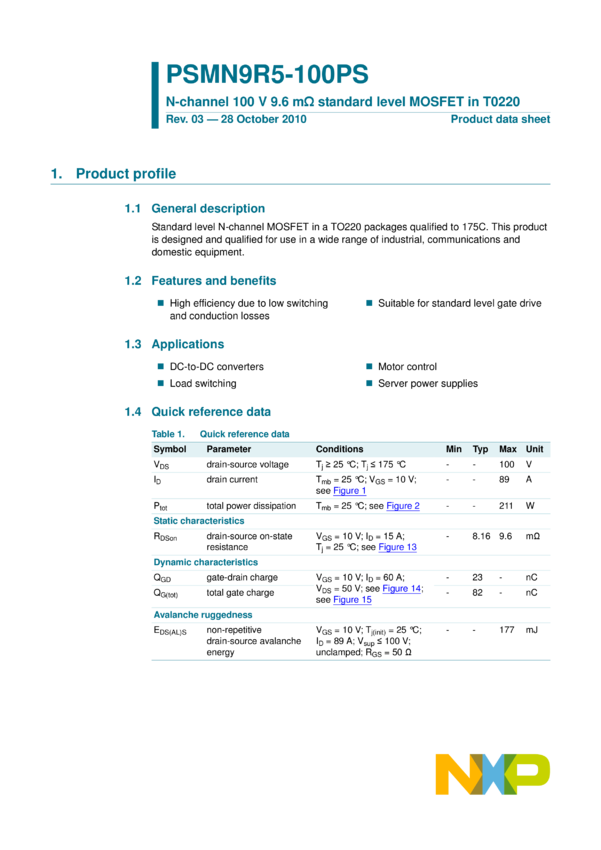 PSMN9R5-100PS N-channel 100 V 9.6 mΩ standard level MOSFET in T0220