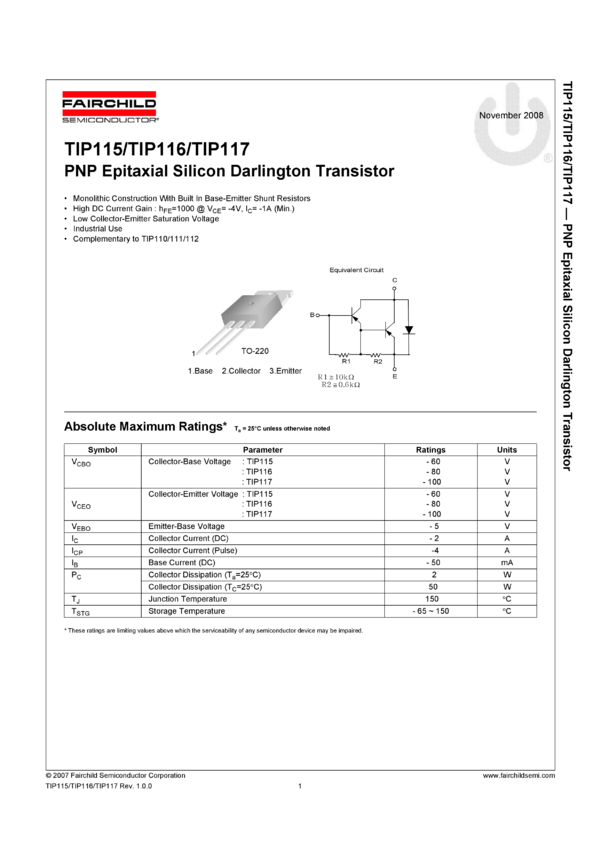 TIP117 PNP Epitaxial Silicon Darlington Transistor