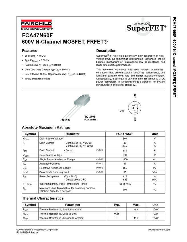 FCA47N60F N-Channel SuperFET<sup>®</sup> FRFET<sup>®</sup> MOSFET 600V, 47A, 73mΩ