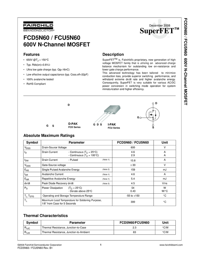 FCD5N60 N-Channel SuperFET<sup>®</sup> MOSFET 600V, 4.6A, 950mΩ