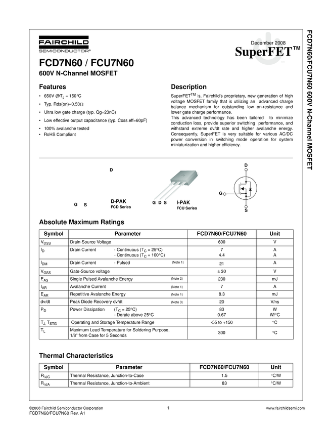 FCD7N60 N-Channel SuperFET<sup>®</sup> MOSFET 600V, 7A, 600mΩ