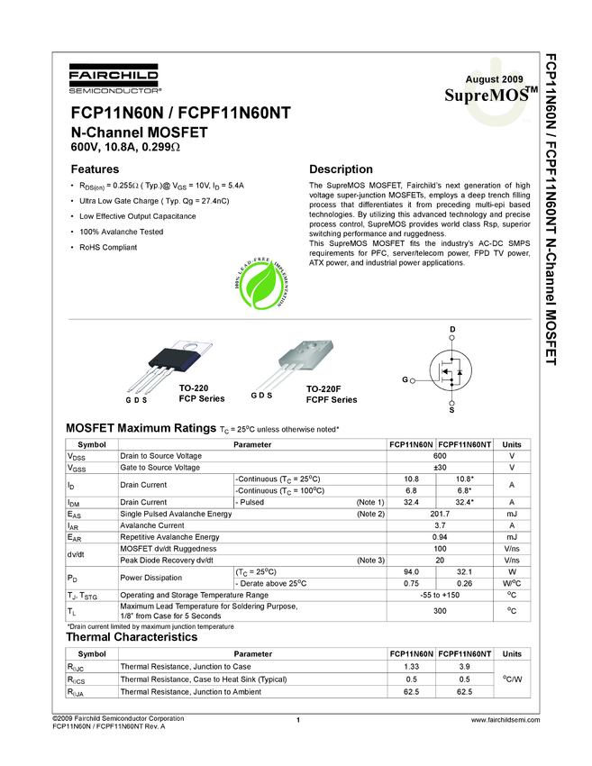 FCP11N60N N-Channel SupreMOS<sup>®</sup> MOSFET 600V, 10.8A, 299mΩ