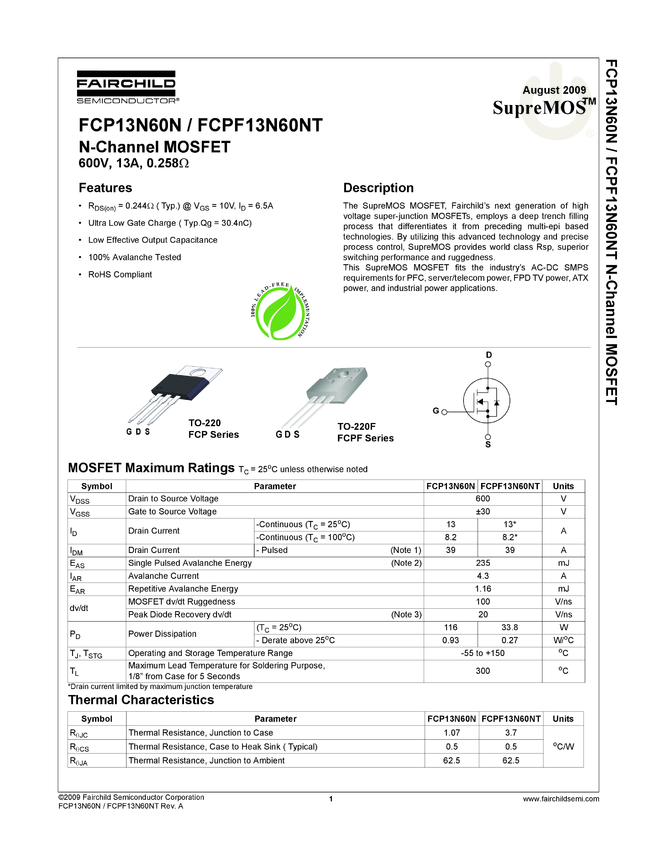 FCP13N60N N-Channel SupreMOS<sup>®</sup> MOSFET 600V, 13A, 258mΩ