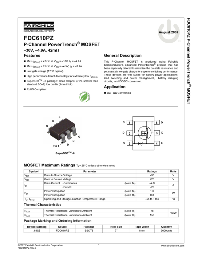 FDC610PZ -30V P-Channel PowerTrench® MOSFET