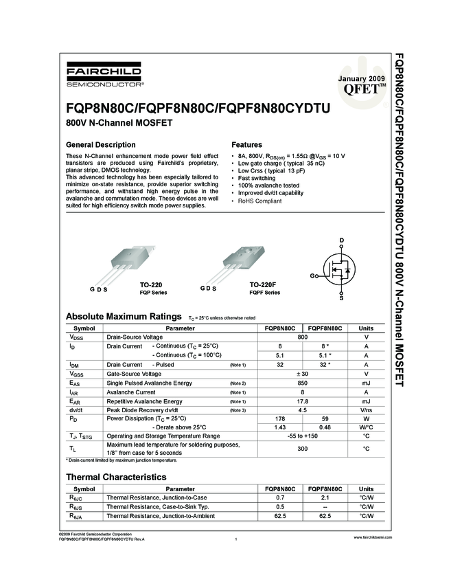 FQP8N80C N-Channel QFET<sup>®</sup> MOSFET 800V, 8A, 1.55Ω