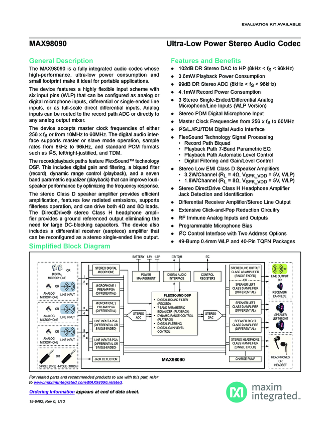 MAX98090 Ultra-Low Power Stereo Audio Codec