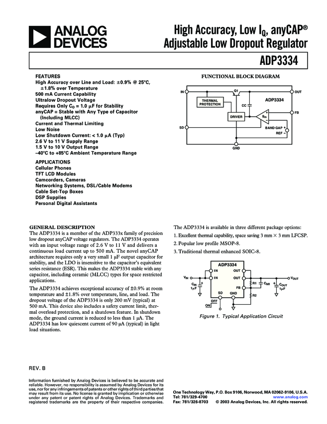 ADP3334: High Accuracy Low I, 500 A anyCAP­® Adjustable Low Dropout Regulator