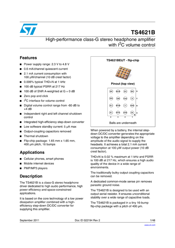 TS4621B High-performance class-G stereo headphone amplifier with I2C volume control