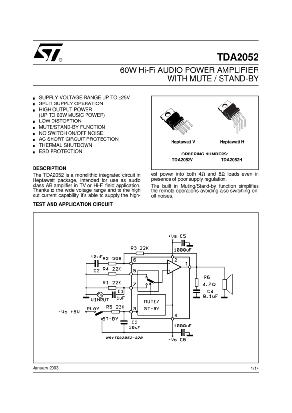 TDA2052 60 W hi-fi audio power amplifier with mute/standby