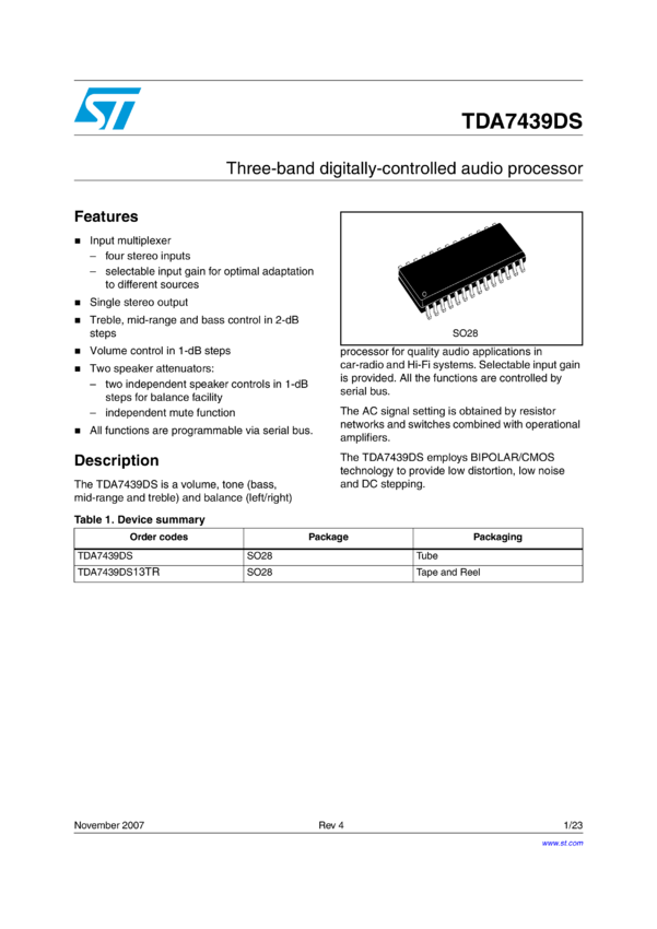 TDA7439DS 3 band tone controlAudio processor