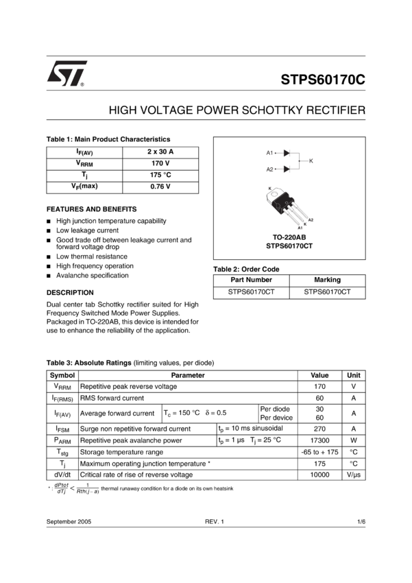 STPS60170C High Voltage Power Schottky Rectifier