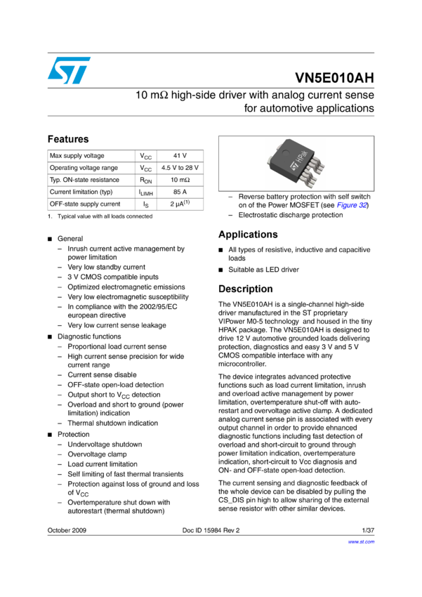VN5E010AH 10 milliohm high-side driver with analog current sense for automotive appli...
