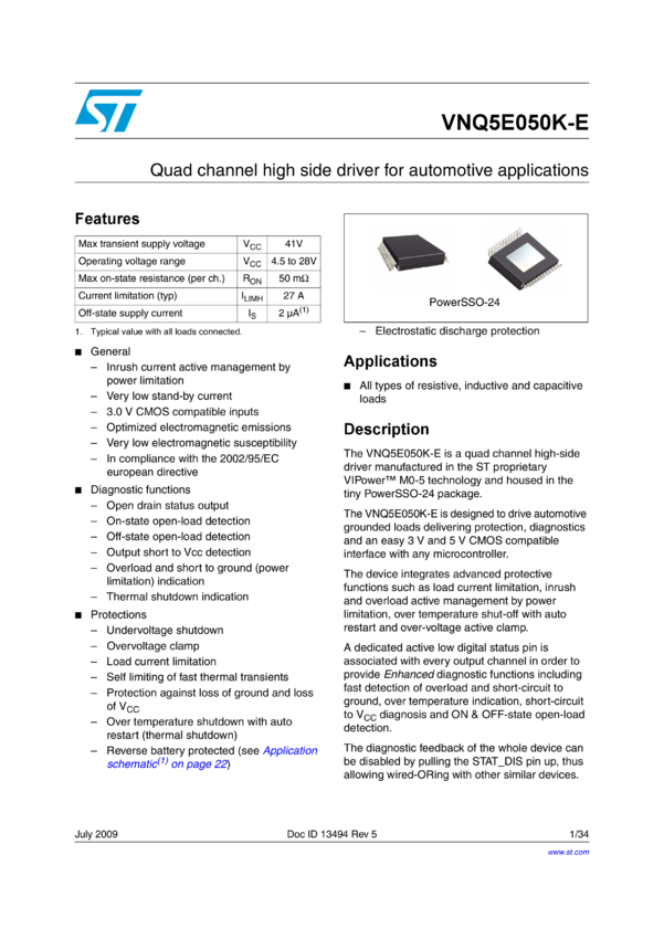 VNQ5E050K-E Quad channel high side driver for automotive applications