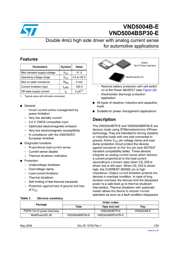 VND5004B-E Double 4m Ohm high side driver with analog current sense for automotive app...