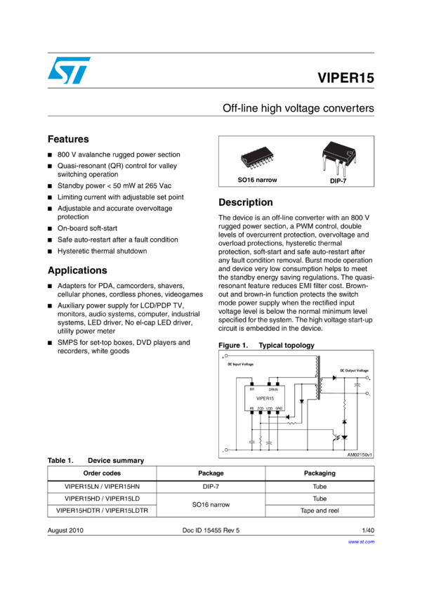 VIPER15 VIPerPlus family: quasi-resonant high performance off line high voltage con...