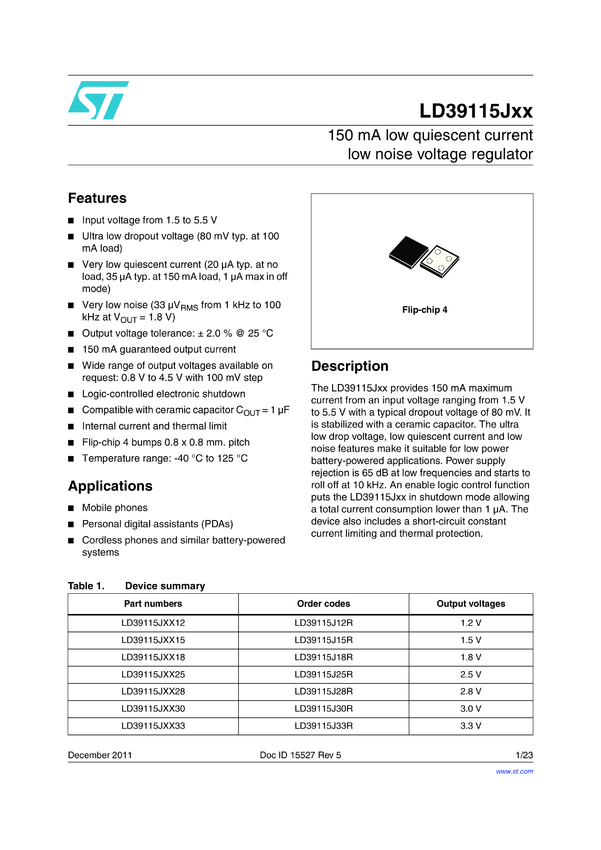 LD39115JXX33 150 mA low quiescent current low noise voltage regulator