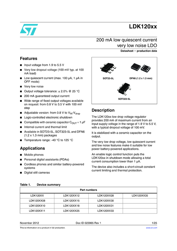 LDK120XX 200 mA low quiescent current very low noise LDO