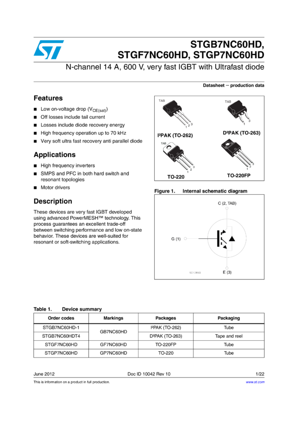 STGP7NC60HD N-channel 14 A, 600 V, very fast IGBT with Ultrafast diode