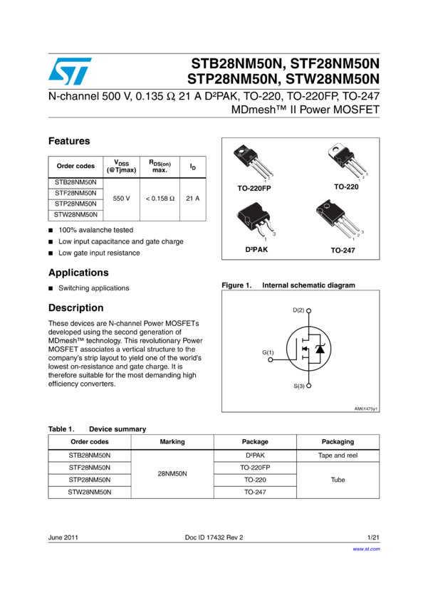 STB28NM50N N-channel 500 V, 0.135 Ohm typ., 21 A MDmesh(TM) II Power MOSFET in D2PAK p...
