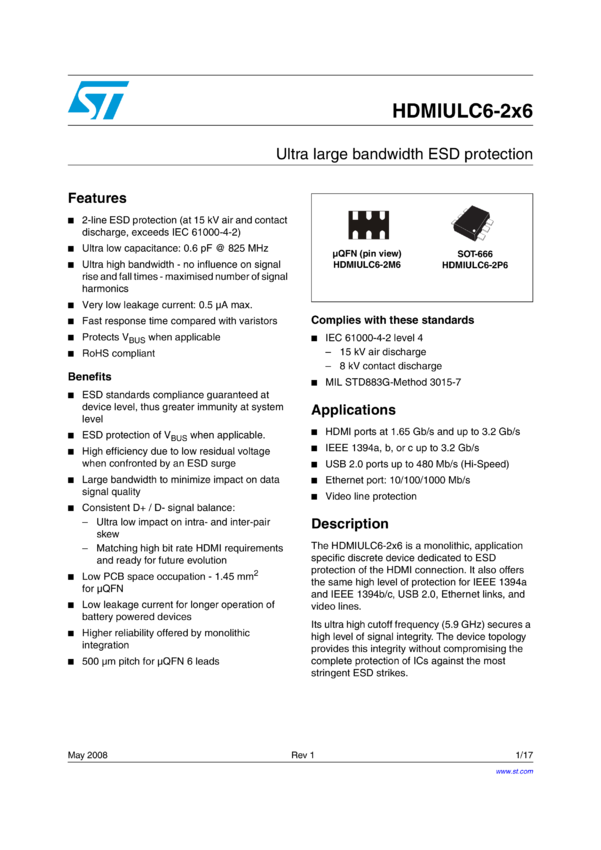 HDMIULC6-2x6 Ultra Low capacitance 2 lines ESD protection