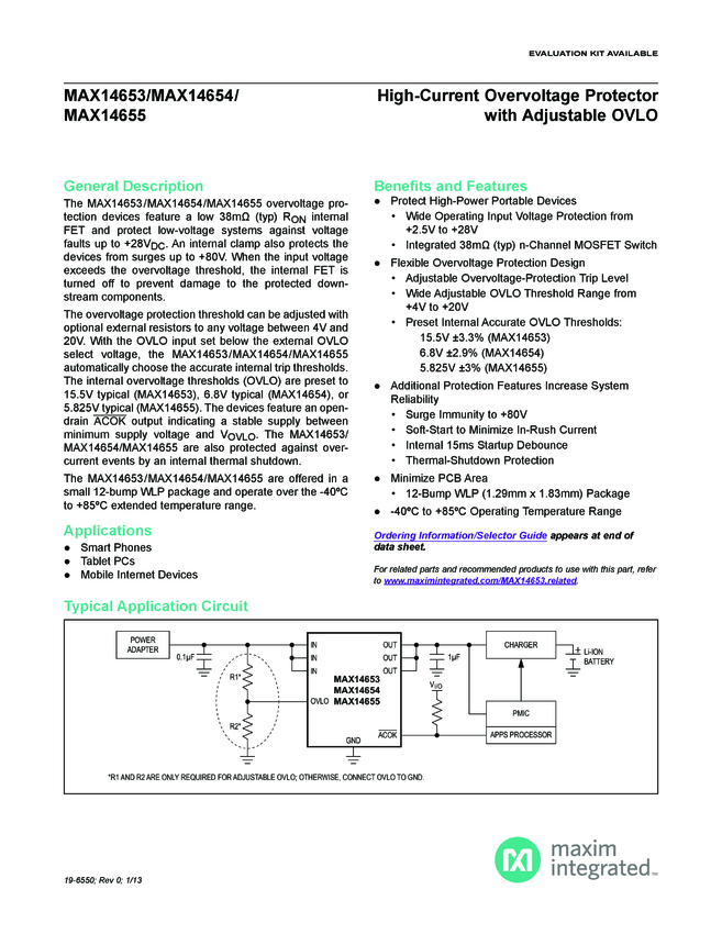 MAX14653 MAX14653, MAX14654, MAX14655 High-Current Overvoltage Protector with Integr...