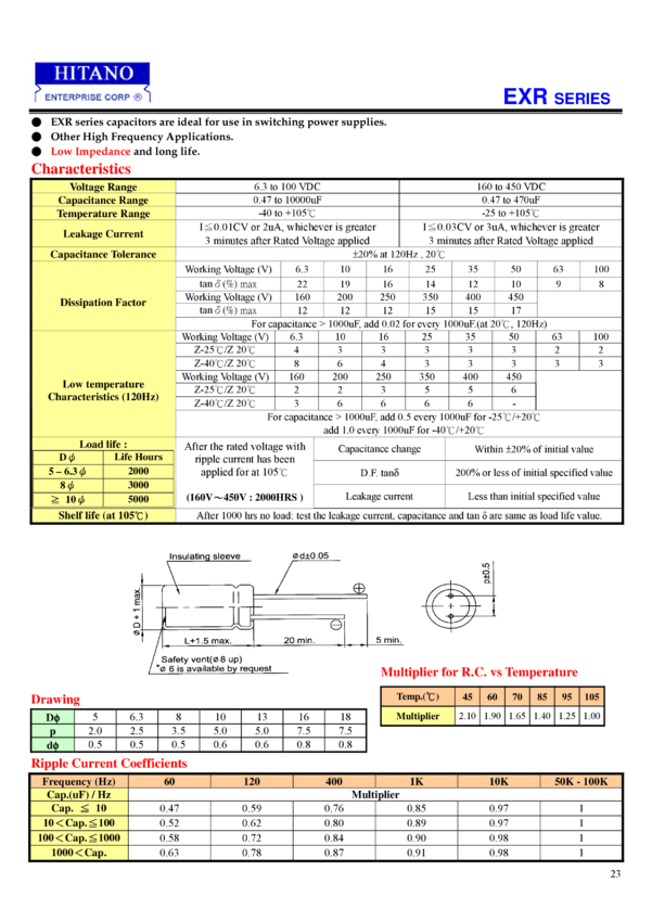 - EXR2,2uF/63V, EXR4,7uF/63V, EXR10uF/50V, EXR10uF/63V, EXR22uF/50V, EXR22uF/63V, EXR47uF/100V, EXR47uF/50V, EXR47uF/63V, EXR68uF/50V, EXR100uF/25V, EXR100uF/50V, EXR100uF/63V, EXR220uF/25V, EXR220uF/50V, EXR330uF/35V, EXR330uF/50V, EXR470uF/16V, EXR470uF/25V, EXR470uF/50V, EXR470uF/63V, EXR680uF/35V, EXR680uF/63V, EXR1000uF/16V, EXR1000uF/25V, EXR1000uF/35V, EXR1000uF/50V, EXR1500uF/35V, EXR2200uF/10V, EXR2200uF/25V