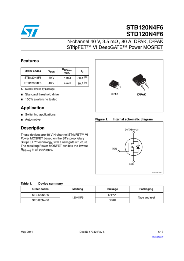 STD120N4F6 N-channel 40 V, 3.5 mOhm, 80 A, D2PAK STripFET(TM) VI DeepGATE(TM) Power MO...