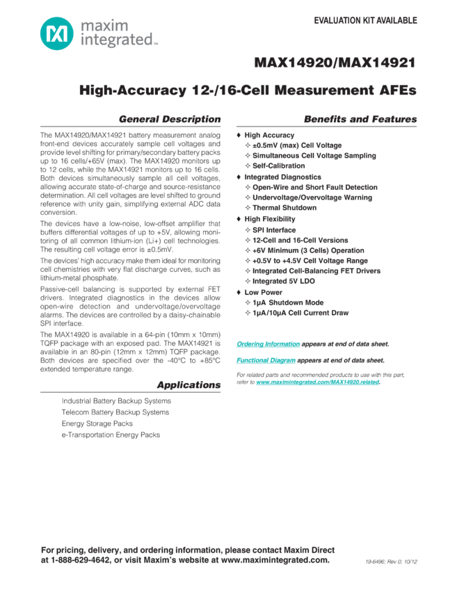 MAX14920 MAX14920, MAX14921 High-Accuracy 12-/16-Cell Measurement AFEs