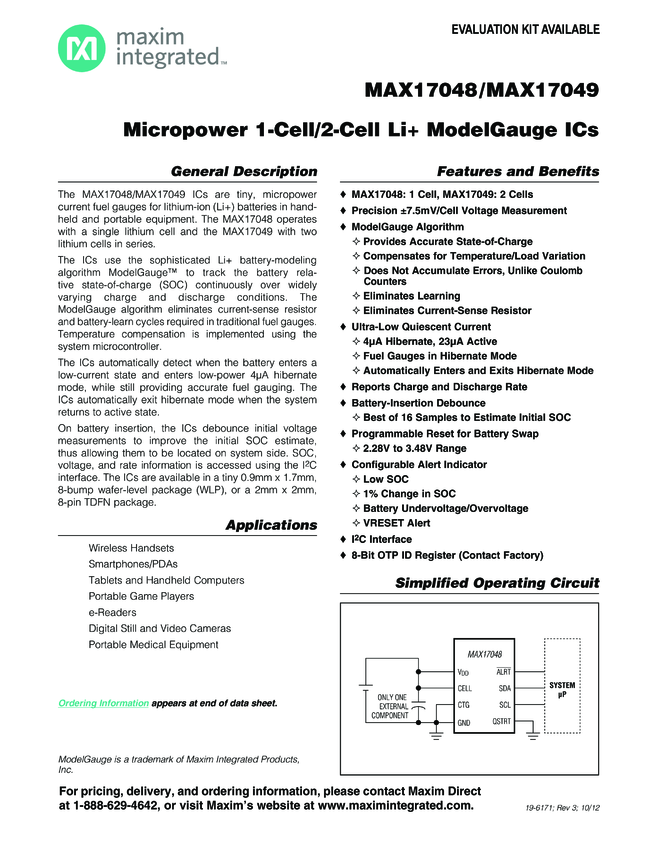 MAX17048, MAX17049 Micropower 1-Cell/2-Cell Li+ ModelGauge ICs