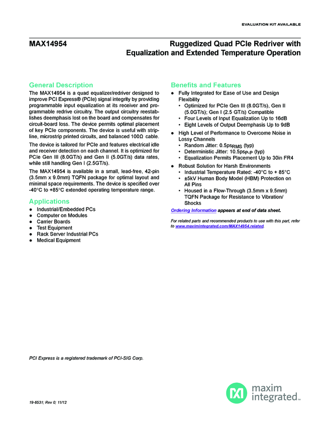 MAX14954 Ruggedized Quad PCIe Redriver with Equalization and Extended Temperature Operation