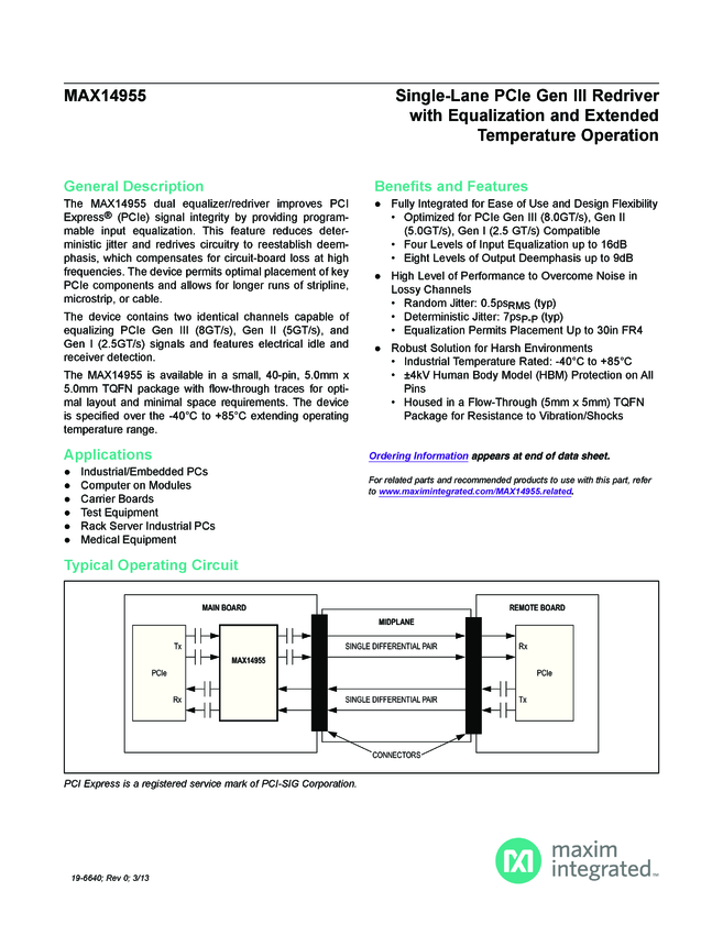 MAX14955 Single-Lane PCIe Gen III Redriver with Equalization and Extended Temperature Operation