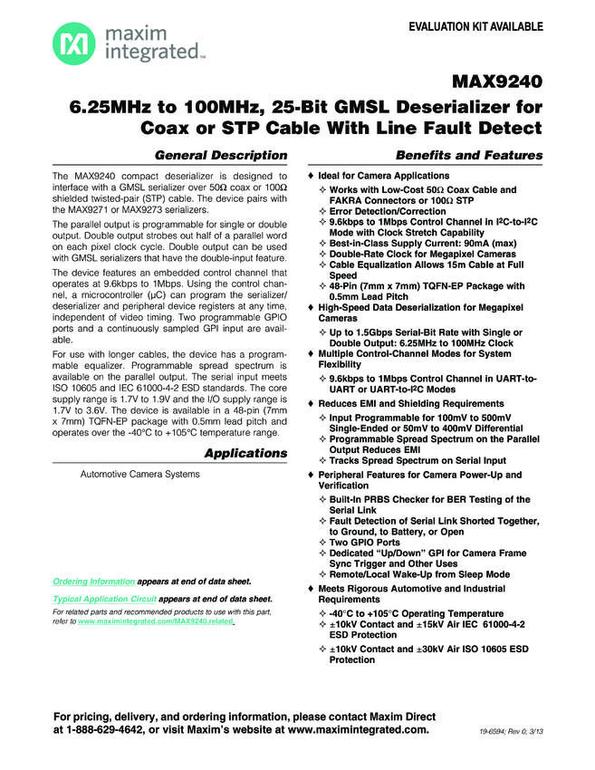 MAX9240 6.25MHz to 100MHz, 25-Bit GMSL Deserializer for Coax or STP Cable with Line...