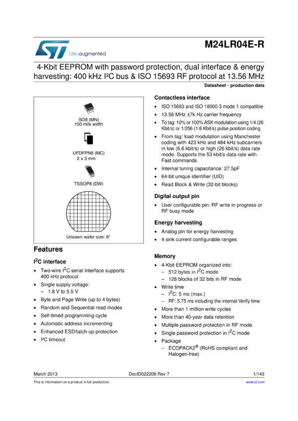 M24LR04E-R 4-Kbit Dual Interface EEPROM with password protection, energy harvesting an...