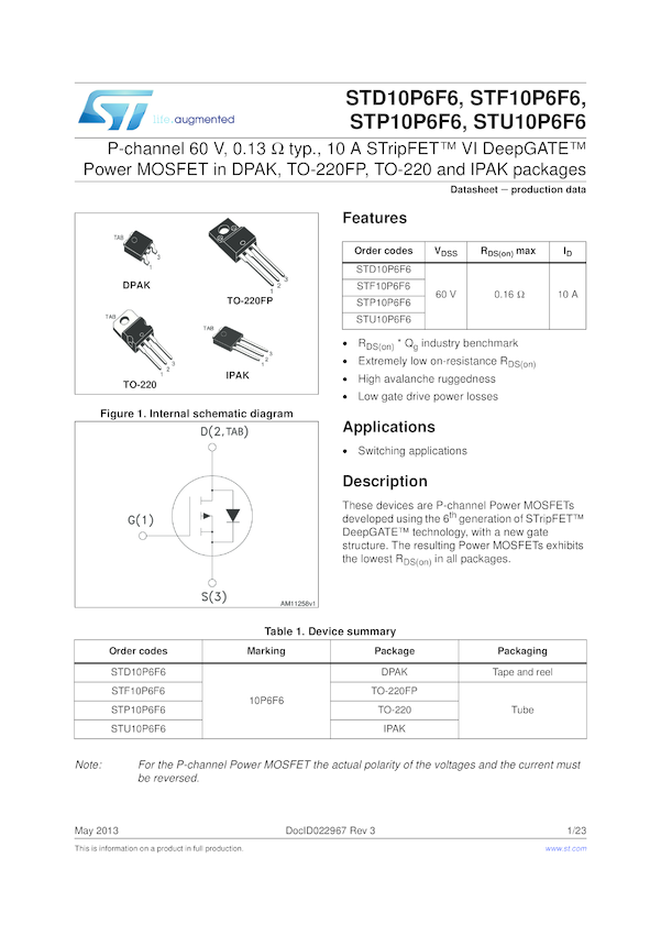 STD10P6F6 P-channel 60 V, 0.13 Ohm typ., 10 A STripFET(TM) VI DeepGATE(TM) Power MOSF...