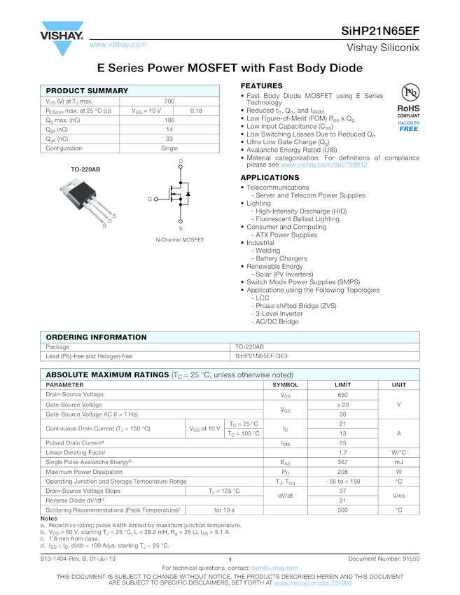 SiHP21N65EF E Series Power MOSFET with Fast Body Diode