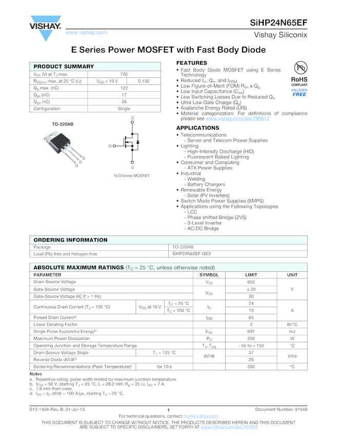 SiHP24N65EF E Series Power MOSFET with Fast Body Diode