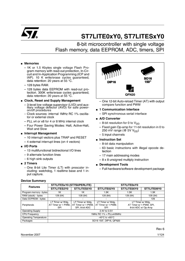 ST7LITE09Y0 8-BIT MCU WITH SINGLE VOLTAGE FLASH MEMORY, DATA EEPROM, ADC, TIMERS, SPI
