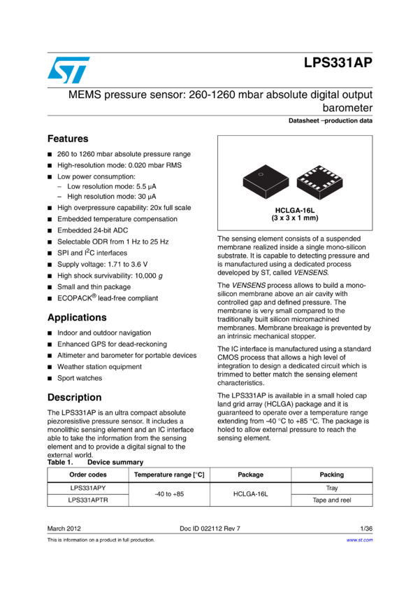 LPS331AP MEMS pressure sensor, 260-1260 mbar absolute digital output barometer