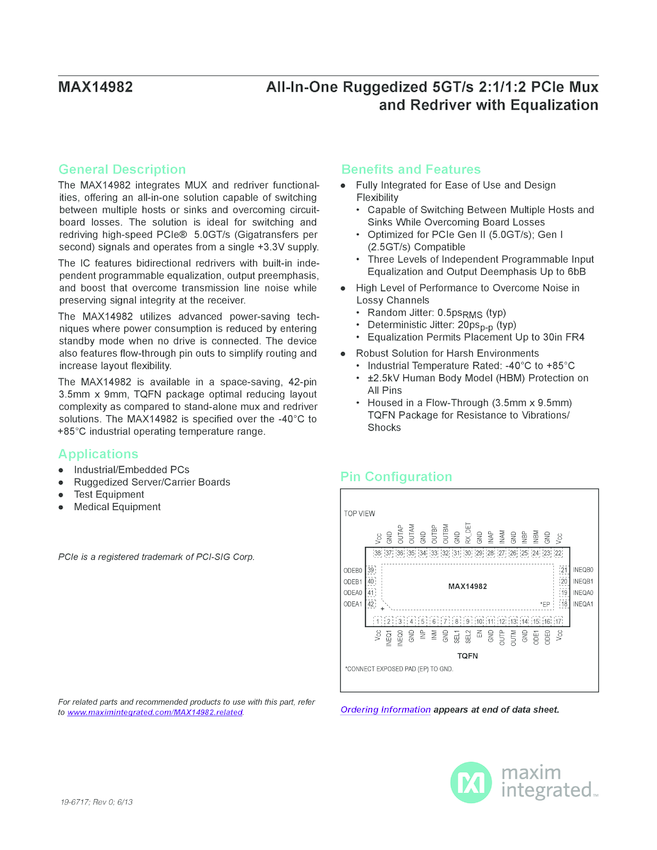MAX14982 All-In-One Ruggedized 5GT/s 2:1/1:2 PCIe Mux and Redriver with Equalization