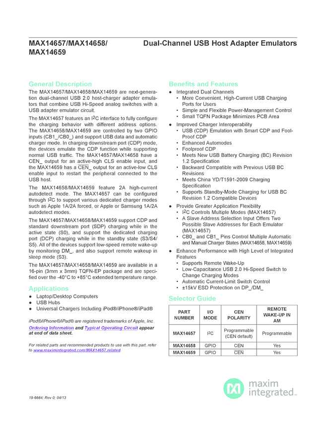 MAX14657 MAX14657, MAX14658, MAX14659 Dual-Channel USB Host Adapter Emulators