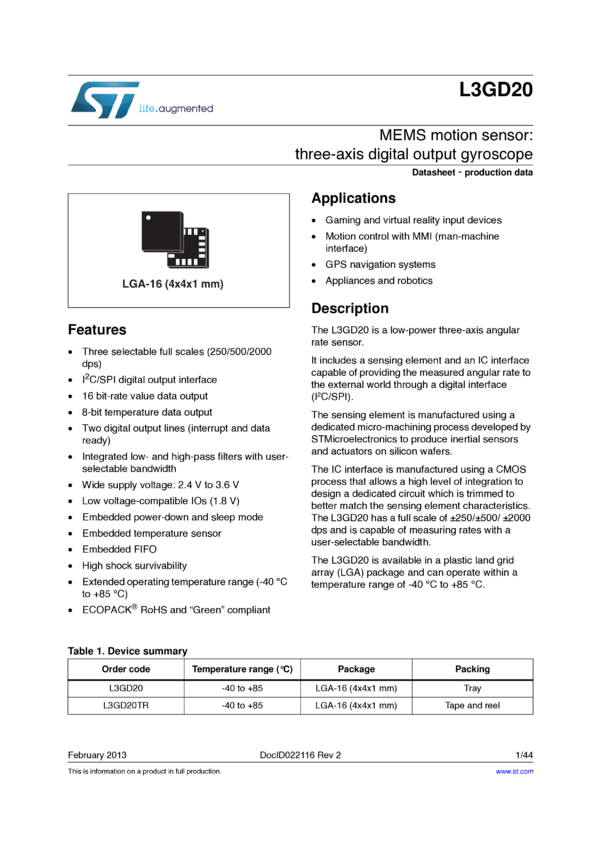 L3GD20 MEMS motion sensor: 3-axis digital gyroscope