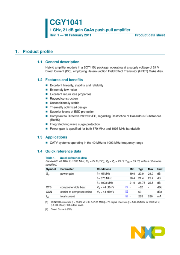CGY1041 1 GHz, 21 dB gain GaAs push-pull amplifier