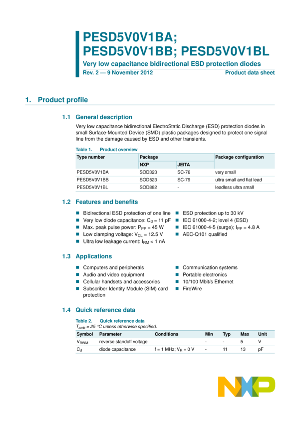 PESD5V0V1BA Very low capacitance bidirectional ESD protection diodes