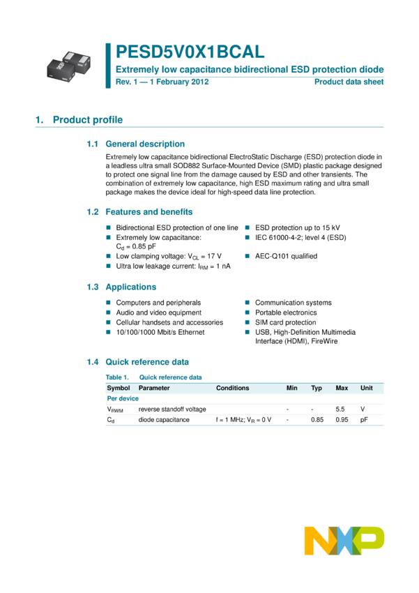 PESD5V0X1BCAL Extremely low capacitance bidirectional ESD protection diode