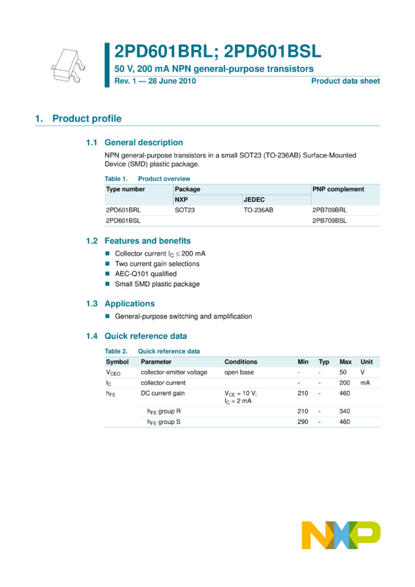 2PD601BRL 50 V, 200 mA NPN general-purpose transistors