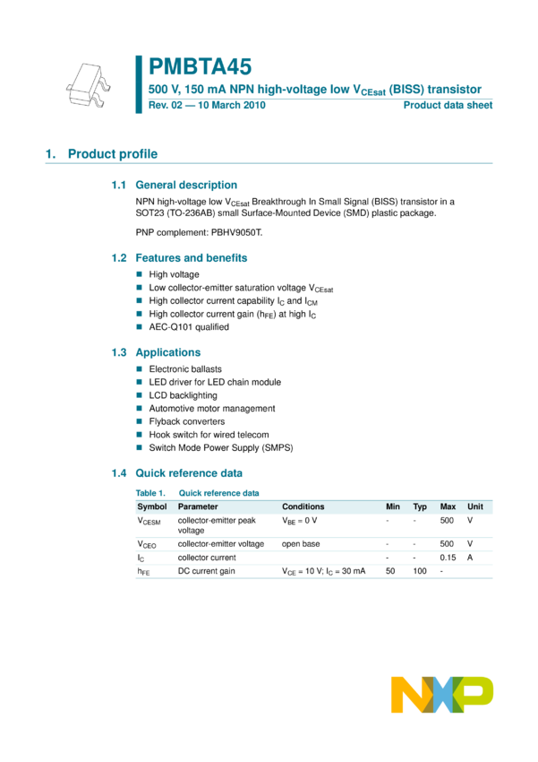 PMBTA45 500 V, 150 mA NPN high-voltage low V_CEsat (BISS) transistor