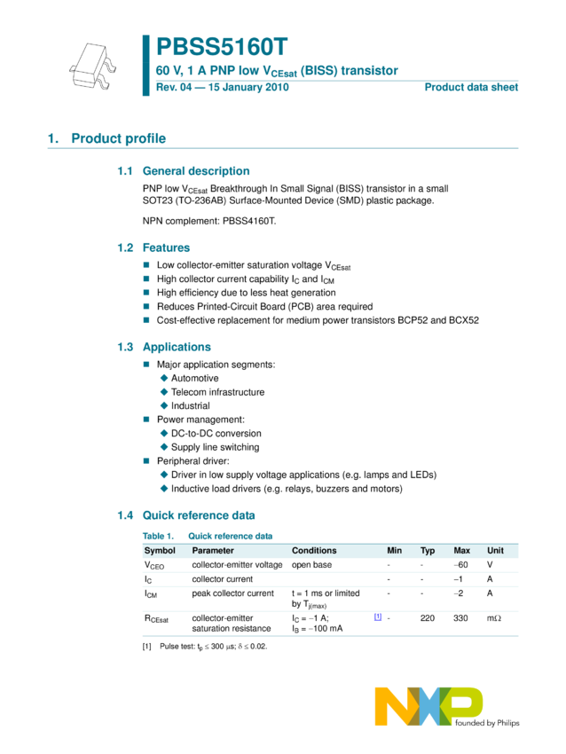 PBSS5160T 60 V, 1 A PNP low VCEsat (BISS) transistor